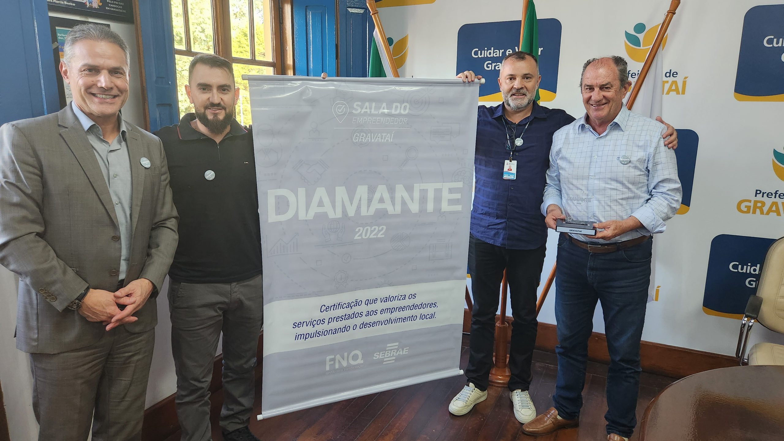 A Sala do Empreendedor de Gravataí recebeu, nesta quinta-feira, 23, a certificação Diamante, que é o mais alto grau da distinção concedida pelo Sebrae RS e pela Fundação Nacional da Qualidade (FNQ). Após análise do reconhecimento entregue na 31ª Mercopar, em outubro de 2022, a FNQ deu ao município a nota máxima em todos os 24 requisitos, que medem a qualidade do atendimento. Um dos destaques disponibilizados pelo município é a plataforma Tudo Fácil, por meio da qual é possível abrir uma empresa de baixo risco em até dez minutos.